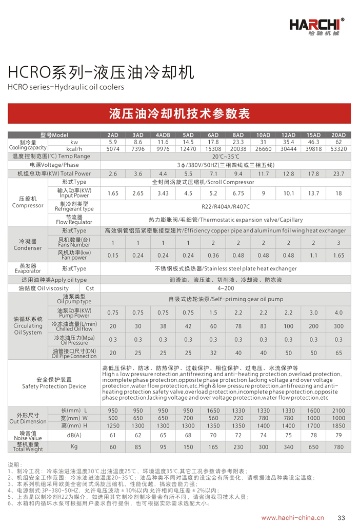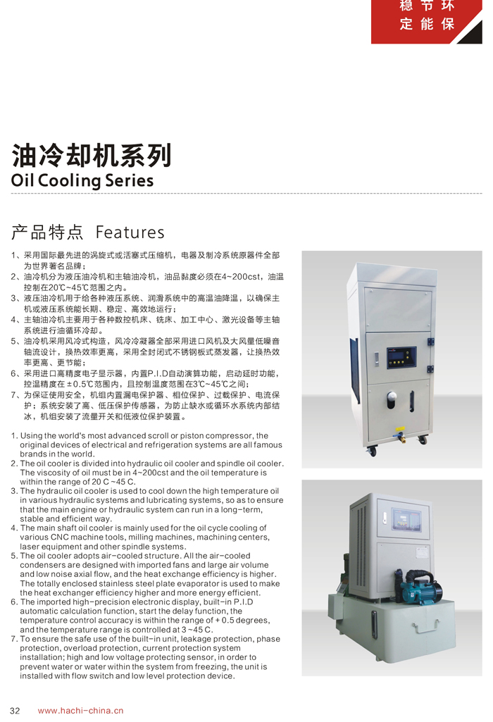 1、制冷能力是在環(huán)境溫度35℃,進油溫度35℃,出油溫度30℃,油品為ISO VG32條件下測得。 2、用戶在選擇油冷機時,必須選擇油液需控制的溫度范圍(1)18℃-25℃ (2)25℃-35℃ (3)35℃-45℃ (4)45℃以上。本公司推薦液壓油合理的溫度控制范圍為35℃-45℃. 3、油冷機吸油口必須用硬管連接,且加裝過濾器。 4、吸油管長度不應(yīng)超過1.5米,如超出必須加粗吸油口。 5、油冷機吸油口應(yīng)靠近設(shè)備回油口,出油口應(yīng)靠近設(shè)備供油口。 6、如吸油口太長,需將油泵與機組分離。 7、以上機組使用環(huán)境為5~42℃,42℃以上屬高溫機組,外形尺寸及相關(guān)參數(shù)會有所變更,請選型時注意。 8、參數(shù)表內(nèi)為本公司標準機型,本公司接受客戶特殊訂貨。 適用種類: ◇ CNC車床、銑床、磨床、拉床 ◇ CNC旋轉(zhuǎn)臺、油壓機、木工雕刻機 ◇ CNC立式/臥式加工中心、綜合切削加工中心 ◇ 高速機械主軸、電主軸、靜壓(動靜壓)主軸 ◇ 各種機械的液壓站及潤滑系統(tǒng) ◇ 放電加工設(shè)備.